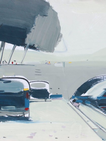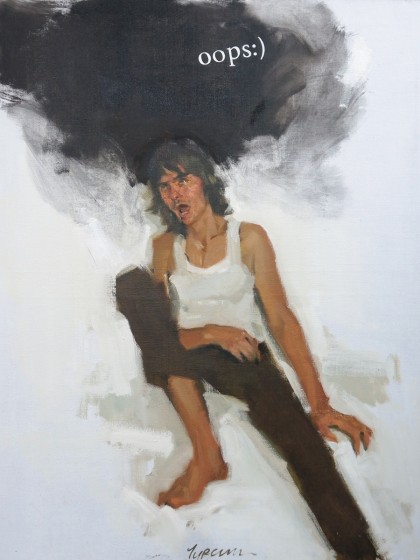 ![]() 2014. Холст, акрил, масло, фломастеры, жилетка работника дорожной службы, боковое зеркало от «Фольксваген Транспортер» 1983 г.. 90х125 см.